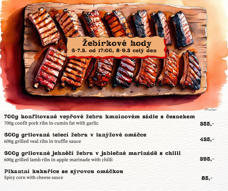Přijďte si užít víkend plný skvělého jídla a vůně grilu! Naše kuchyně vám připraví dokonale šťavnatá žebra v několika lahodných úpravách a k tomu chutné přílohy, které tento zážitek skvěle doplní.
